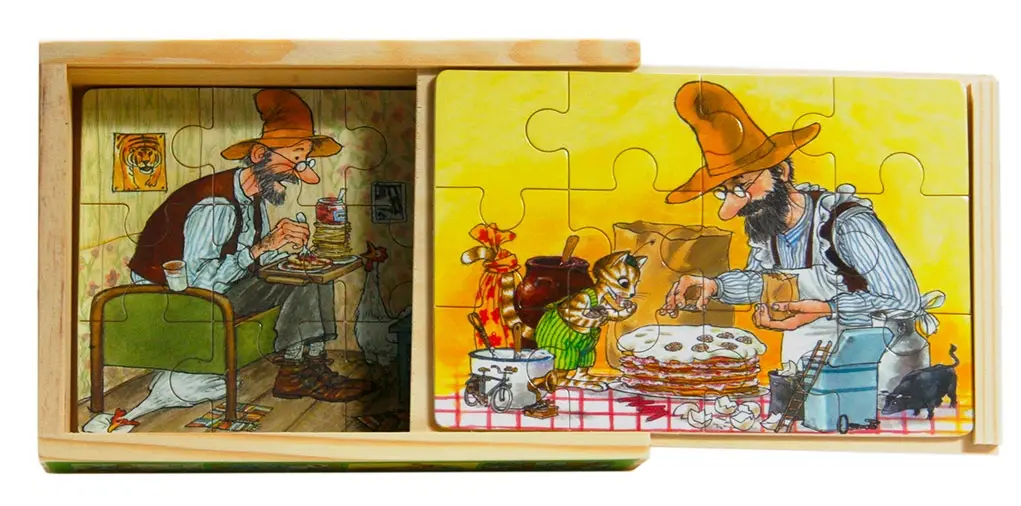 En fin trälåda som innehåller 4st träpussel på 12 bitar vardera, med motiv av Pettson & Findus.