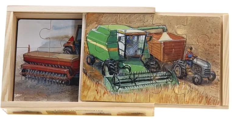 En fin trälåda som innehåller 4st träpussel på 12 bitar vardera, med motiv av Mulle Meck och hans jordbruksmaskiner.