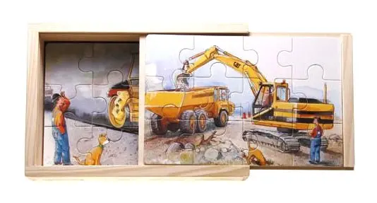 En fin trälåda som innehåller 4st träpussel på 12 bitar vardera, med motiv av Mulle Meck och hans vägmaskiner.