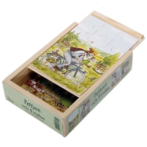 En fin trälåda som innehåller 4st träpussel på 12 bitar vardera, med olika motiv ur serien om Pettson och hans katt Findus.