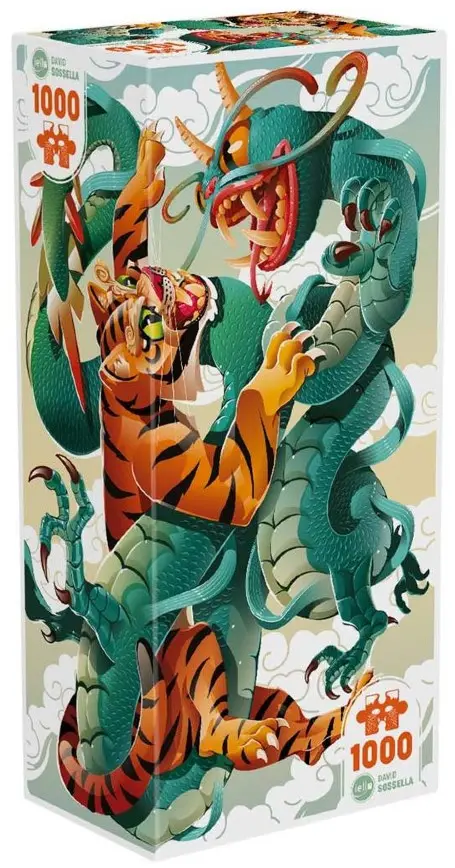 En kamp mellan en stor tiger och en mäktig turkos drake utspelar sig framför pusslaren. Ett pussel som säkert kan ge dig en extra klurig pusselstund. De två kraftfulla figurerna har komplementära färger, vilket kan göra det lättare att identifiera pusselbitarna, men att lyckas urskilja mönstren på deras huvuden respektive svansar kommer säkert att vara en större utmaning.