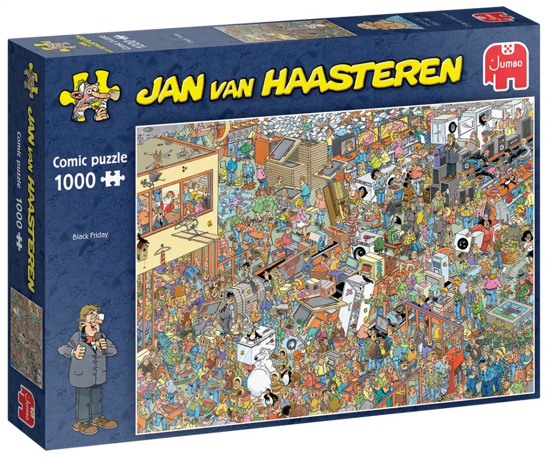 Det är "Black Friday", en av årets stora shoppingdagar med utförsäljning och rea-priser överallt. Självklart är Jan Van Haasteren-gänget ute för att fynda (tillsammans med alla andra människor i stan).