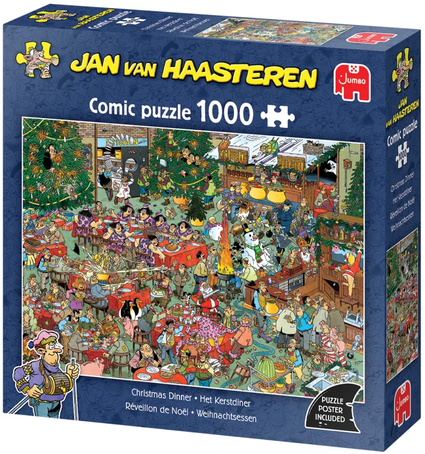 I det här motivet från jan Van Haasteren studios bjuds vi in till ett riktigt gästabud. På borden finns ostfondue, kalkoner, korvar och potatisar och Glühwinet verkar gå åt i rask takt.
