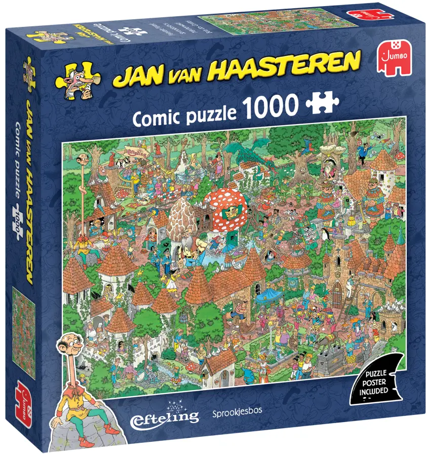 Familjen Jan van Haasteren åker till den populära nöjesparken ”De Efteling”. Sagoskogen är en av deras favoritattraktioner, och vi förstår varför! När de utforskar parken möter de en rad olika scener ur klassiska sagor. Författaren Charles Perraults saga "Tummeliten" handlar om en pojke som kämpar mot en jätte och lyckas stjäla hans sjumilastövlar, men i parken idag verkar det finnas någon annan som är boven i dramat!