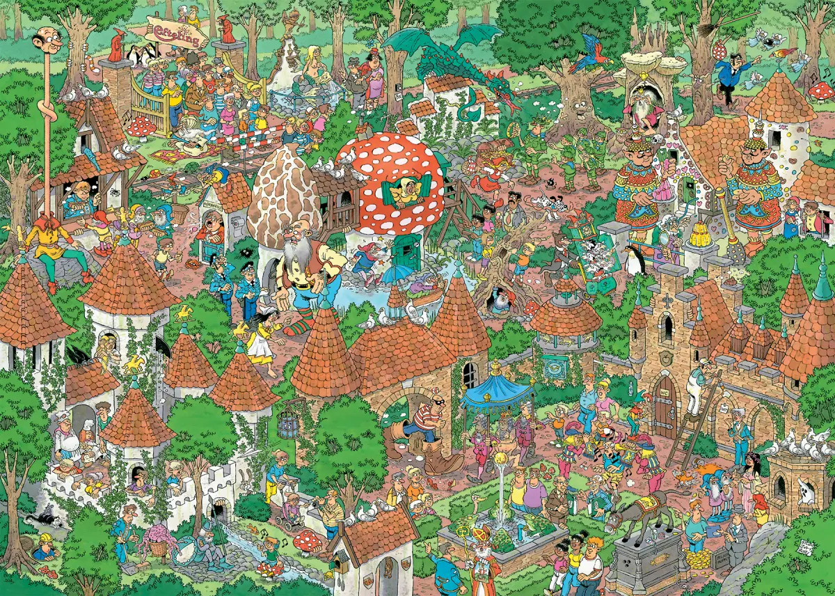 Ett fantasifullt och händelserikt pusselmotiv av tecknaren Rob Derks på Jan Van Haasteren Studios.