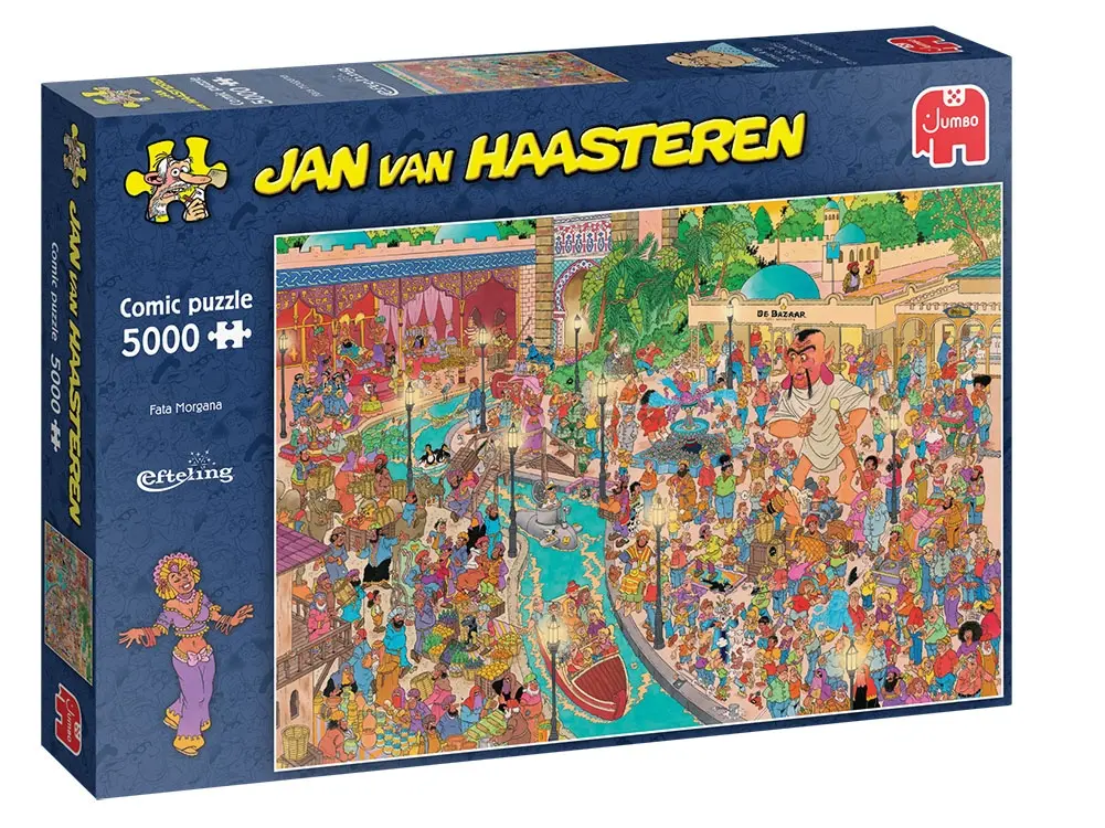 I det här folkmyllrande motivet tar Jan Van Haasteren teamet med oss till temaparken Efteling, och parkens Fata Morgana område.