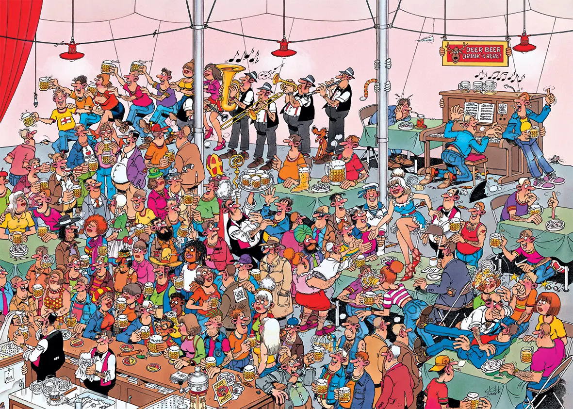 Pusslet är illustrerat av serietecknaren och humormästaren Jan Van Haasteren, med öga för detaljrikedom och pusselglädje i varje pusselbit!