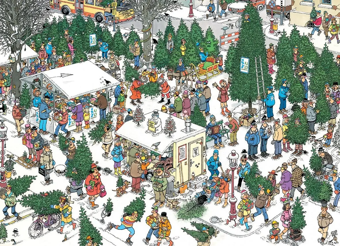 Jan Van Haasteren familjen är på Julgransmarknad idag och här finns det mängder av Julgranar i olika storlekar att välja mellan. Stadens invånare har samlats för att hitta den perfekta granen för just deras hem, Tomten och St. Nicholas ska också köpa gran idag, och Octo verkar ha tagit jobb som Julgransförsäljare!