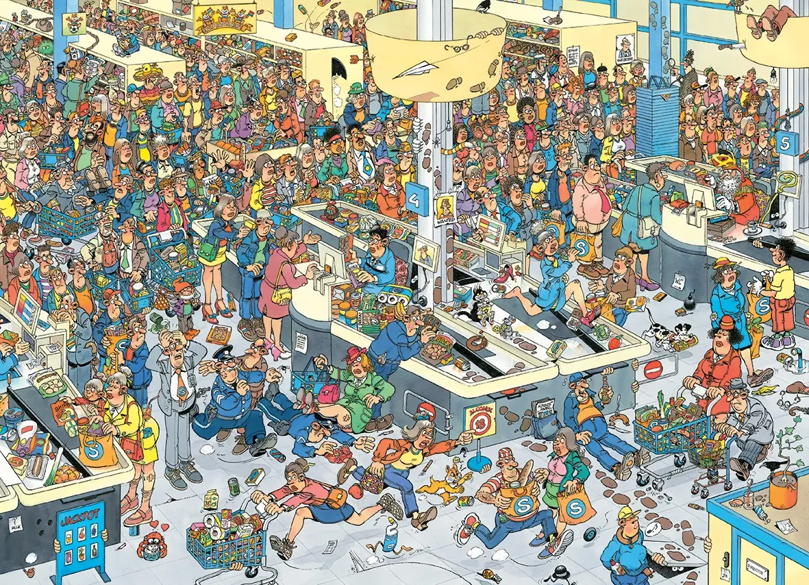 Men alla kunder har inte rent mjöl i påsen, en tjuv verkar ha stulit en påse mat och polisen gör allt va de kan för att springa ikapp förövaren. Känn pulsen öka och roa dig med att upptäcka alla finurliga detaljer i det här händelserika pusselmotivet från Jan Van Haasteren Studios!