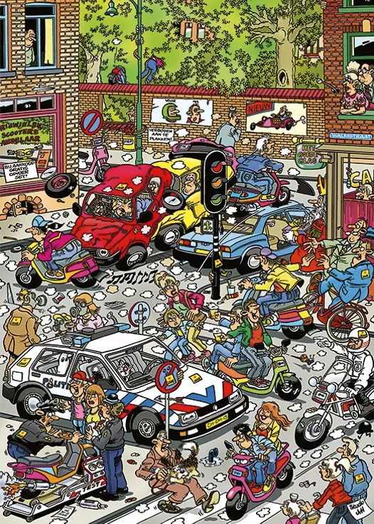 Ett färgsprakande humoristiskt och detaljrikt Jan Van Haasteren motiv fullt av färd och fläkt!