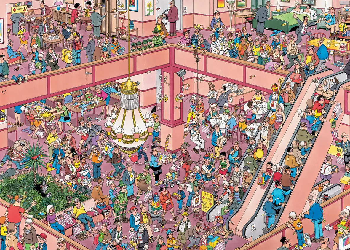 Det är en helt vanlig dag i stadens lyxiga galleria och shoppingsugna kunder trängs i butiker och rulltrappor. Eller helt vanlig är den nog ändå inte. Som vanligt i Van Haasterens motiv händer det en hel del oväntade och komiska saker. Är det en tjuv jag ser springa iväg med ett stort byte? Får man verkligen prova sängarna på det där avklädda sättet? Och är det här verkligen en bra plats för en gorilla?