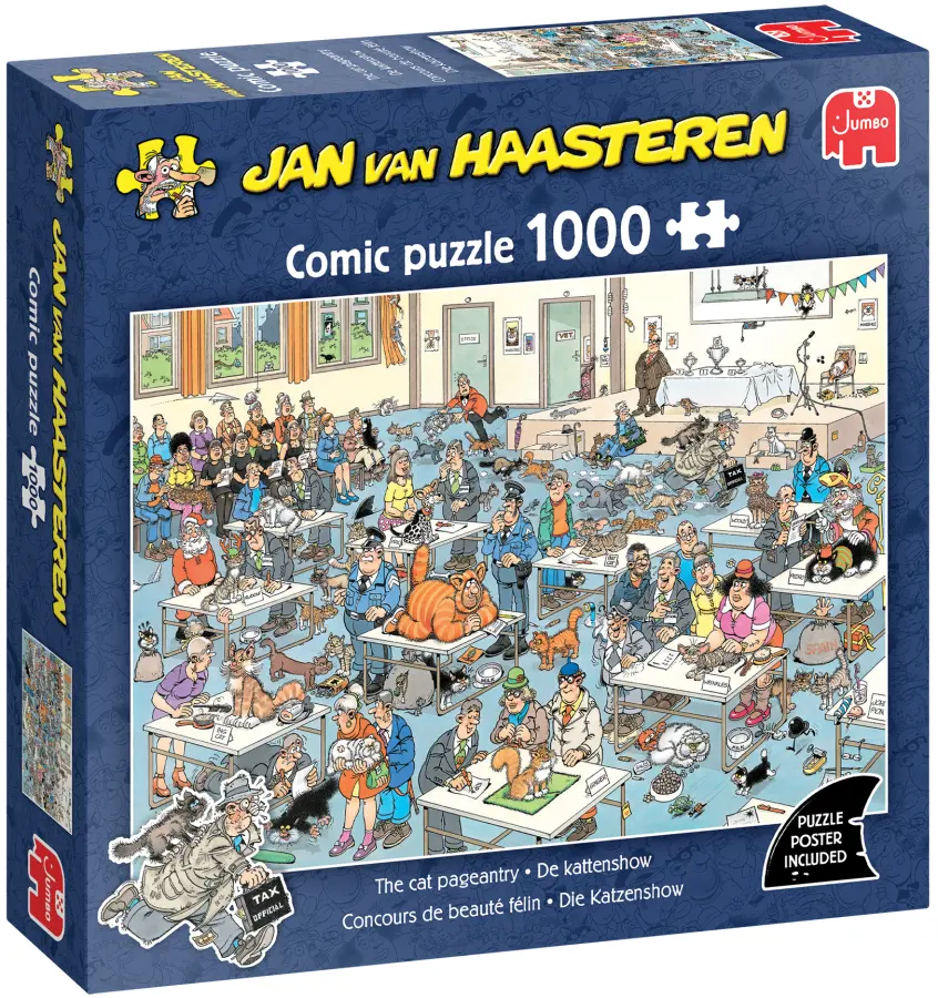 På kattutställningen är alla igång med att stolt visa upp sina älskade och vackra djur. Men är alla tävlande verkligen katter eller finns det fuskare också? Domarna har svårt att utse sina vinnare med allt kaos som händer runt omkring dem. Kan du hitta den ursprungliga katten från familjen Jan van Haasteren någonstans i motivet?