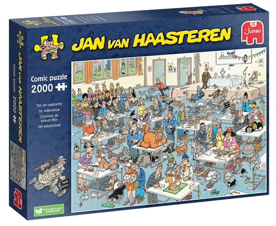 På kattutställningen är alla igång med att stolt visa upp sina älskade och vackra djur. Men är alla tävlande verkligen katter eller finns det fuskare också? Domarna har svårt att utse sina vinnare med allt kaos som händer runt omkring dem. Kan du hitta den ursprungliga katten från familjen Jan van Haasteren någonstans i motivet?