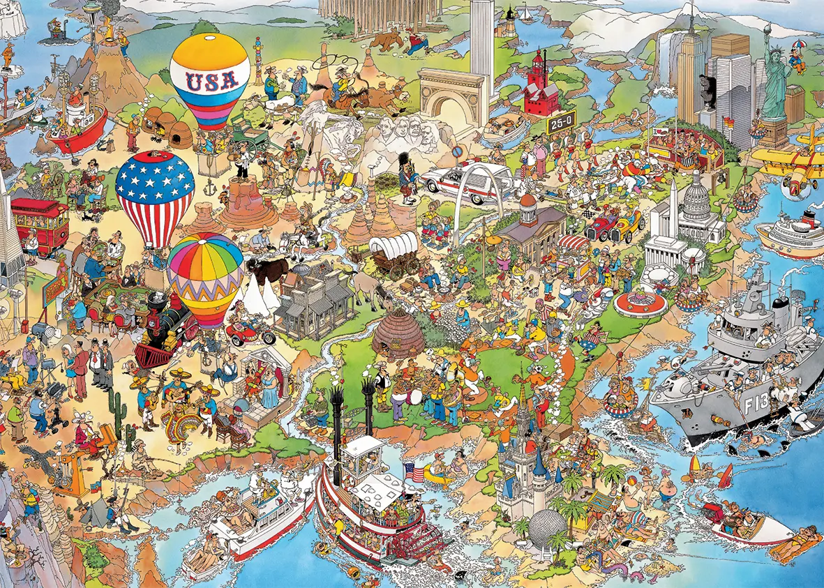 I den här kartan trängs mängder av USAs kända landmärken tillsammans med en målande beskrivning av landets historia. Vi ser symboler från landets kolonialisering och ursprungsbefolkning till den vilda västern, cheerleading-kulturen, filmernas Hollywood och Floridas rika stränder. Ett härligt detaljrikt motiv med massor att upptäcka medan du lägger bitarna på plats!
