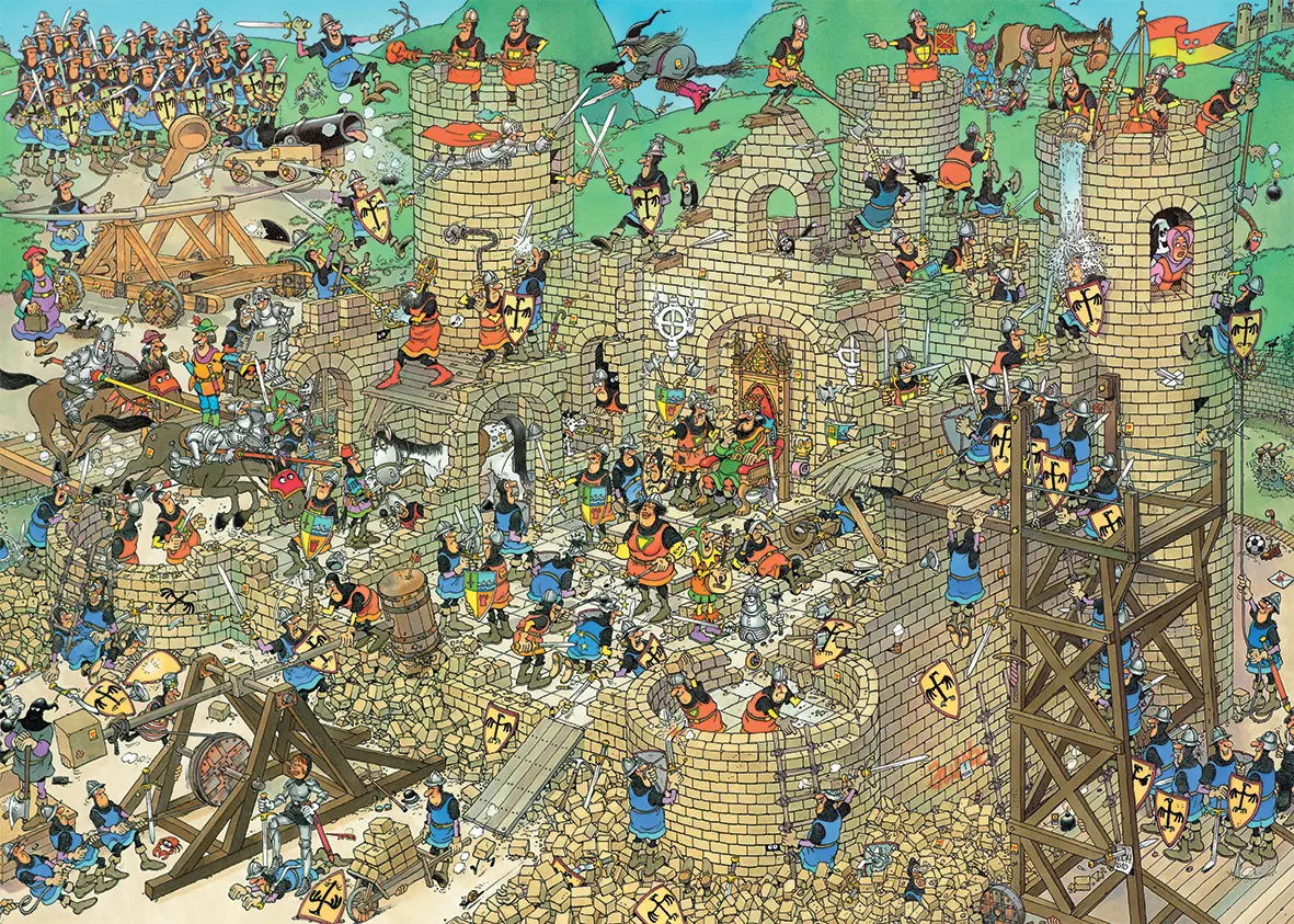 Byggsten på byggsten på byggsten.... i det här medeltida motivet har humortecknaren Jan Van Haasteren haft fullt upp att rita mängder av små fyrkantiga bitar som sakta ska bli en mäktig medeltida borg! Men mitt i byggandet kommer ett anfall och invånarna hamnar under belägring, tappra riddare strider mot varandra för att skydda den ädle Konungen. Men det ser inte så ljust ut, katapulter har redan fått bygget att rämna, hur ska detta sluta?
