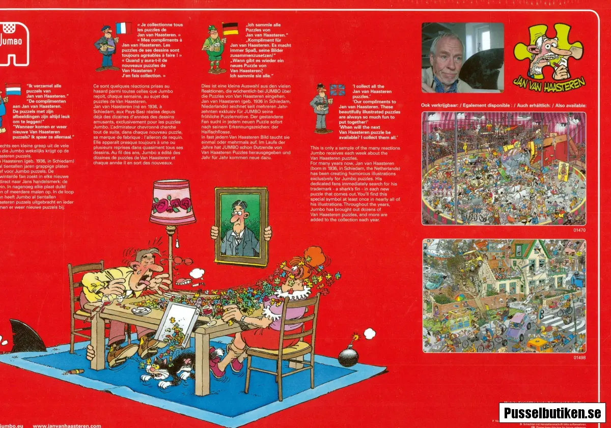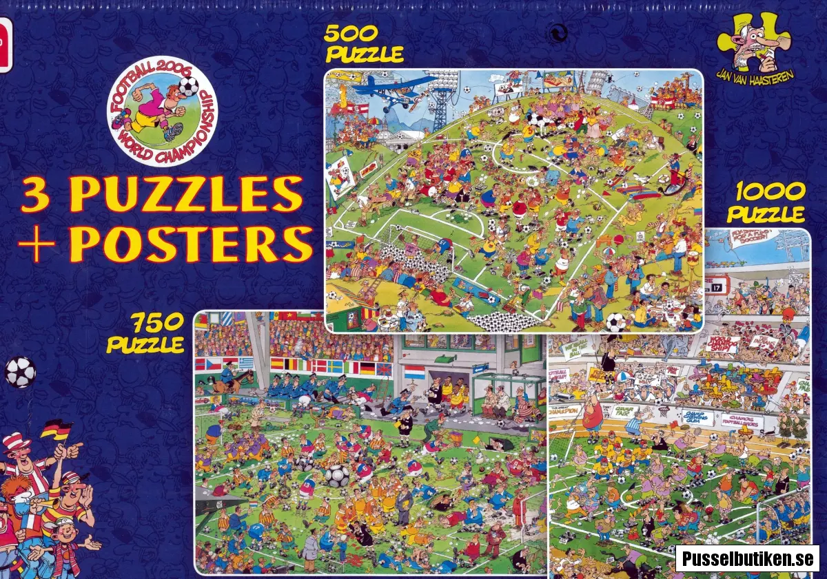 Tecknade humorpussel med tre olika pussel i varierade storlekar i samma kartong. Samtliga tre pussel har fotbollsmotiv, 500 bitar, 750 bitar och 1000 bitar.