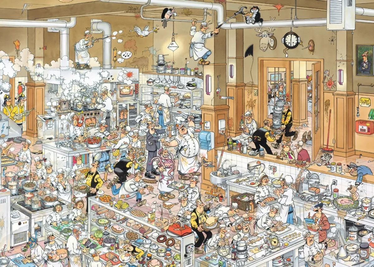 Tecknat humorpussel med motiv av storkök, 1000 bitar.
