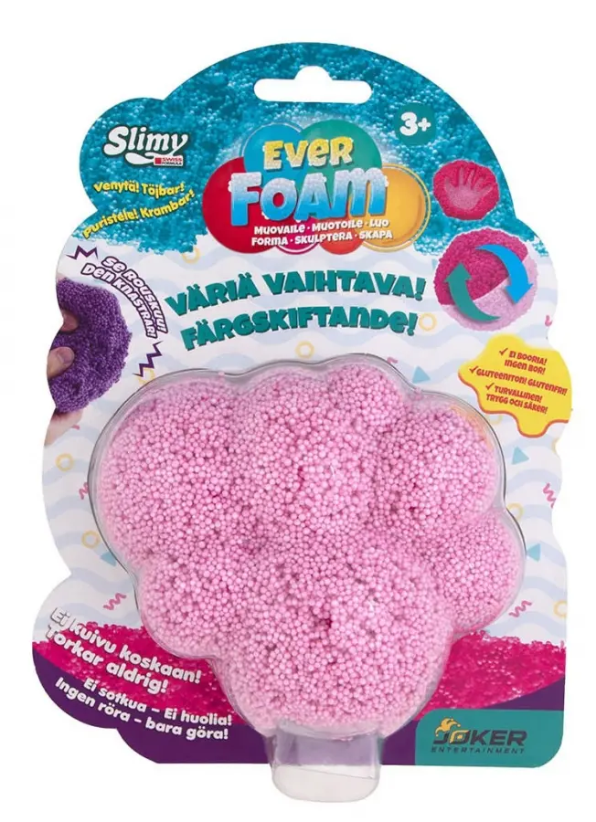 Vid 26-31 graders värme skiftar massan färg från ljus till mörk! Pärlmassan torkar aldrig och den är härligt knastrande när man klämmer på den. Man kan leka med pärlmassan i vatten, för den flyter. Kulornas diameter är ca 2 mm. Den här förpackningen innehåller 220 ml enfärgad Everfoam-massa i blått eller rosa (vilken färg du får avgörs av slumpen).