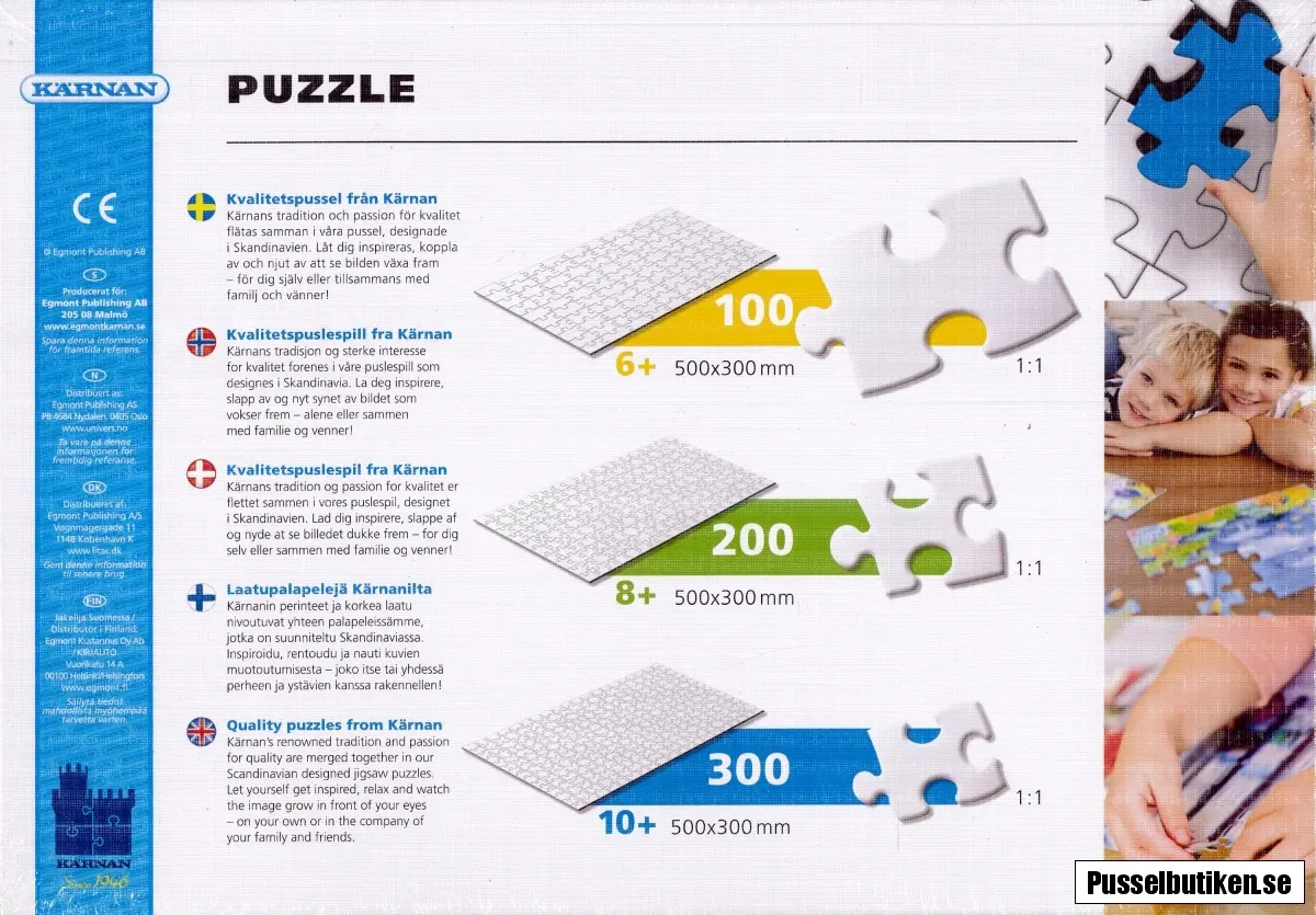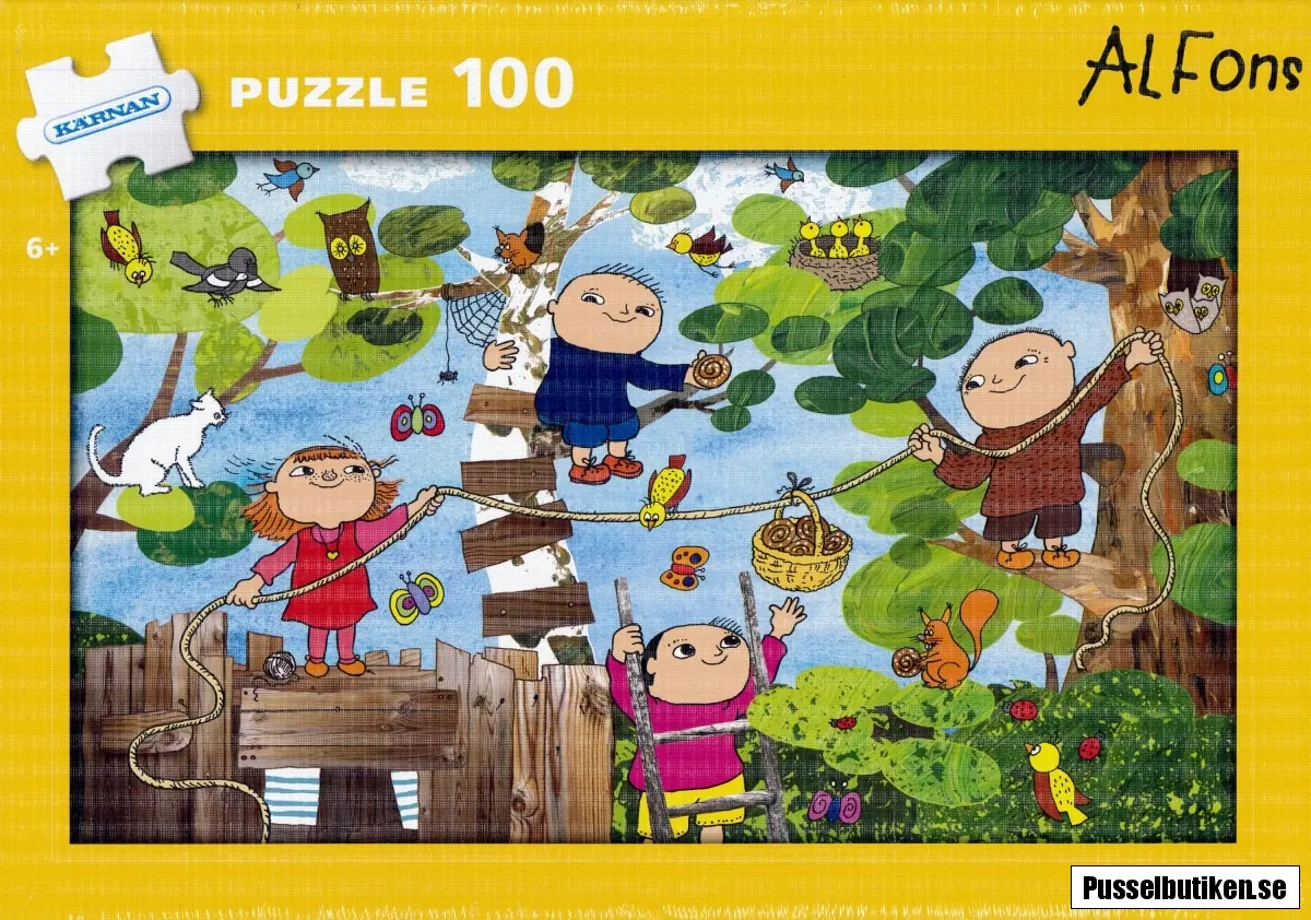Pussel med 100 bitar och motiv från den älskade serien med Alfons Åberg. Alfons bygger kojor och klättrar i träd med sina kompisar. Bitarna är större och mer greppvänliga än vanliga pusselbitar, tillverkare av pusslet är svenska Egmont Kärnan.