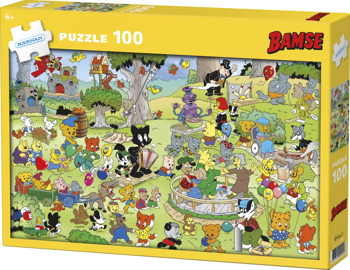 Pussel med 100 bitar och motiv av världens starkaste björn Bamse. Bamse är i äventyrsparken med vänner och familj. I parken kan man dansa på dansbanan, bli dragen av en åsna, kasta prick och grilla korv. Motivet är färgglatt och detaljrikt. Bitarna är större och mer greppvänliga än vanliga pusselbitar.