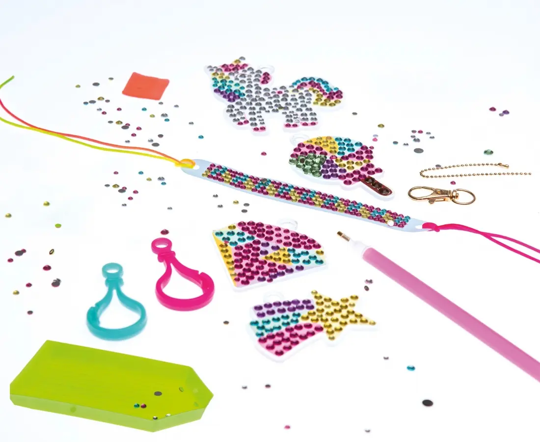 Innehåller: 4 olika figurer, 2 armband, 2 kulkedjor med hake, 3 plasthakar, kristaller i olika färger, specialverktyg, geleplatta, bricka, snöre och instruktioner.