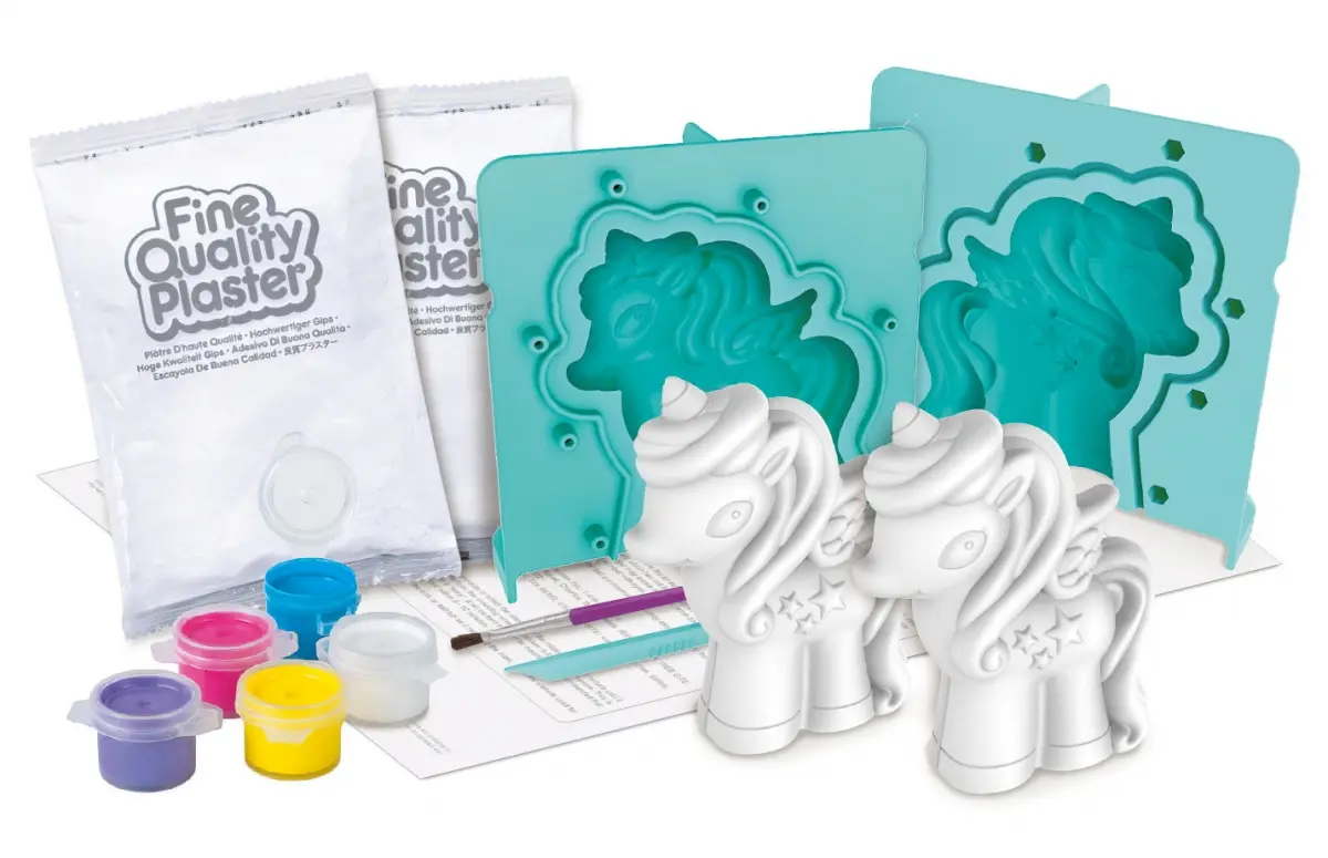 Innehåller: En tvådelad gjutform, gipspulver, 5 små målarfärgsburkar med olika färger, pensel och instruktioner.