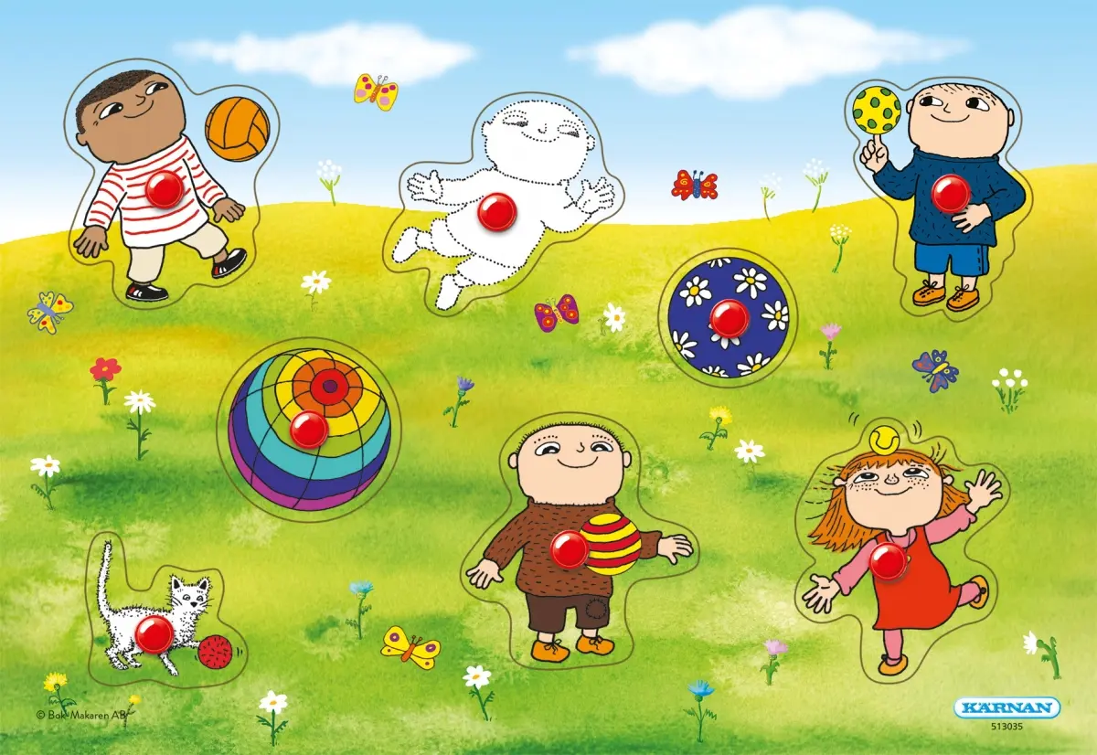 Ett fint knoppussel där Alfons och hans vänner leker med bollar på en äng.