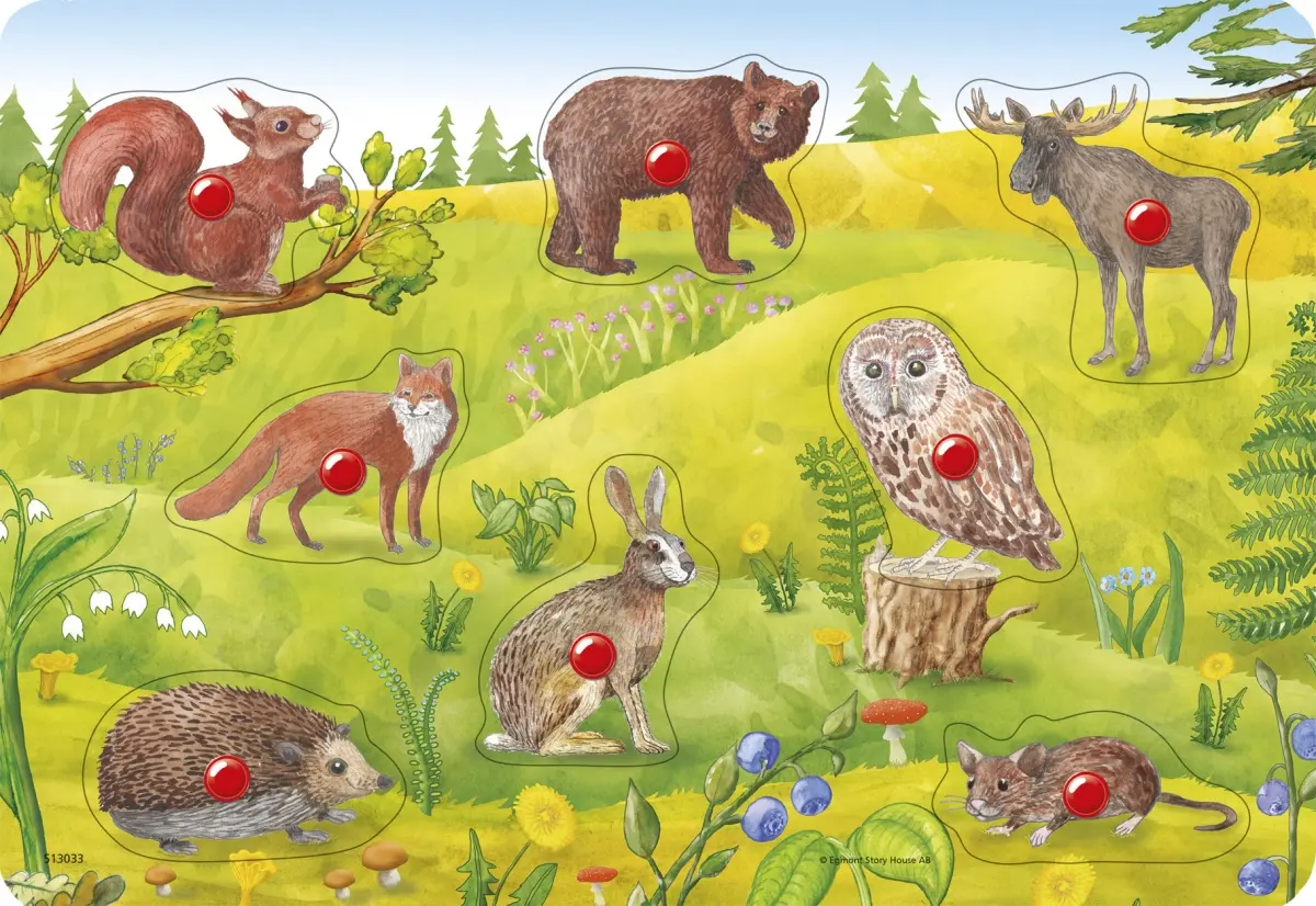 I en glänta i skogen ser vi typiskt nordiska djurarter som kan synas i de svenska skogarna samt vanligt förekommande växter och blommor. Här möter vi en hare, igelkott, ekorre, räv, björn, skogsmus, uggla och sist men verkligen inte minst, skogens konung, Älgen.