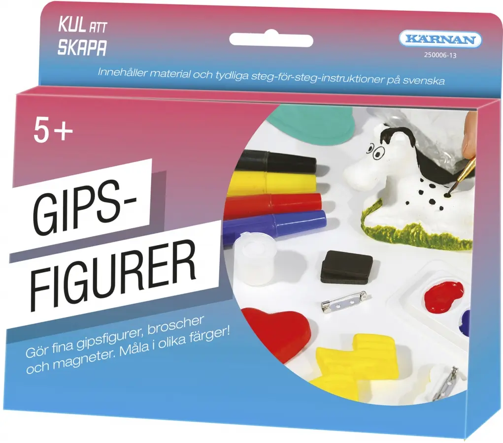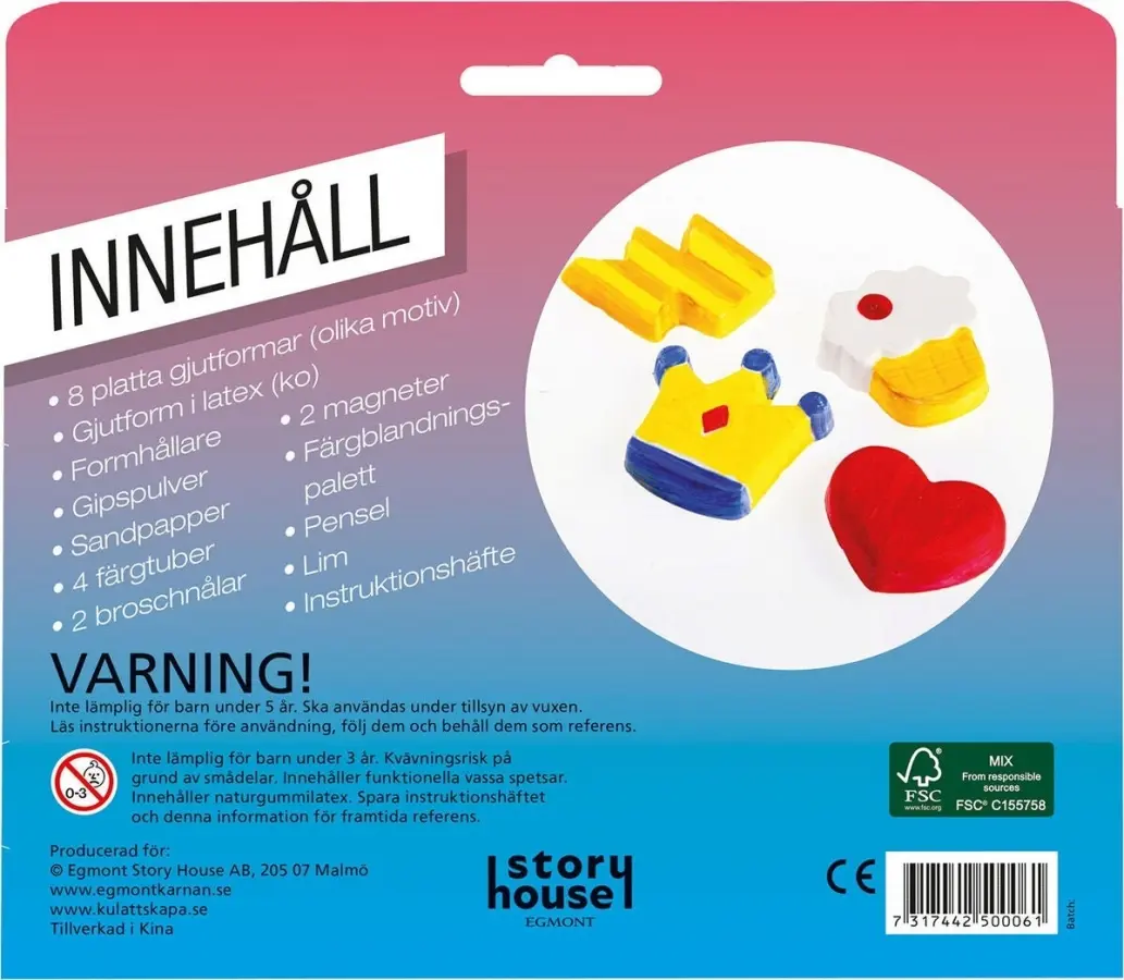 Innehåller: 8 platta gjutformar (olika motiv), gjutform i latex, formhållare, gipspulver, sandpapper, 4 färgtuber, 2 broschnålar, 2 magneter, färgblandningspalett, pensel, lim och instruktioner.