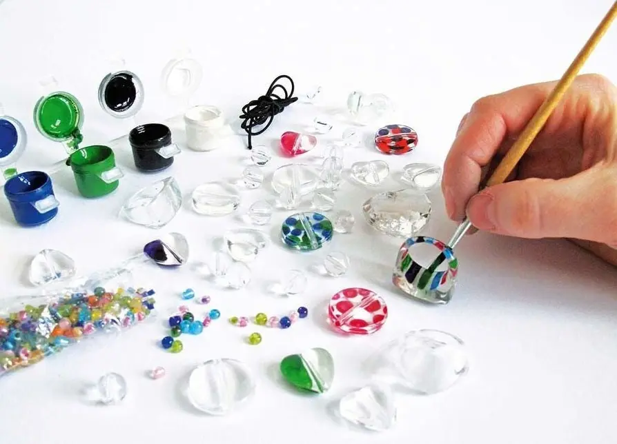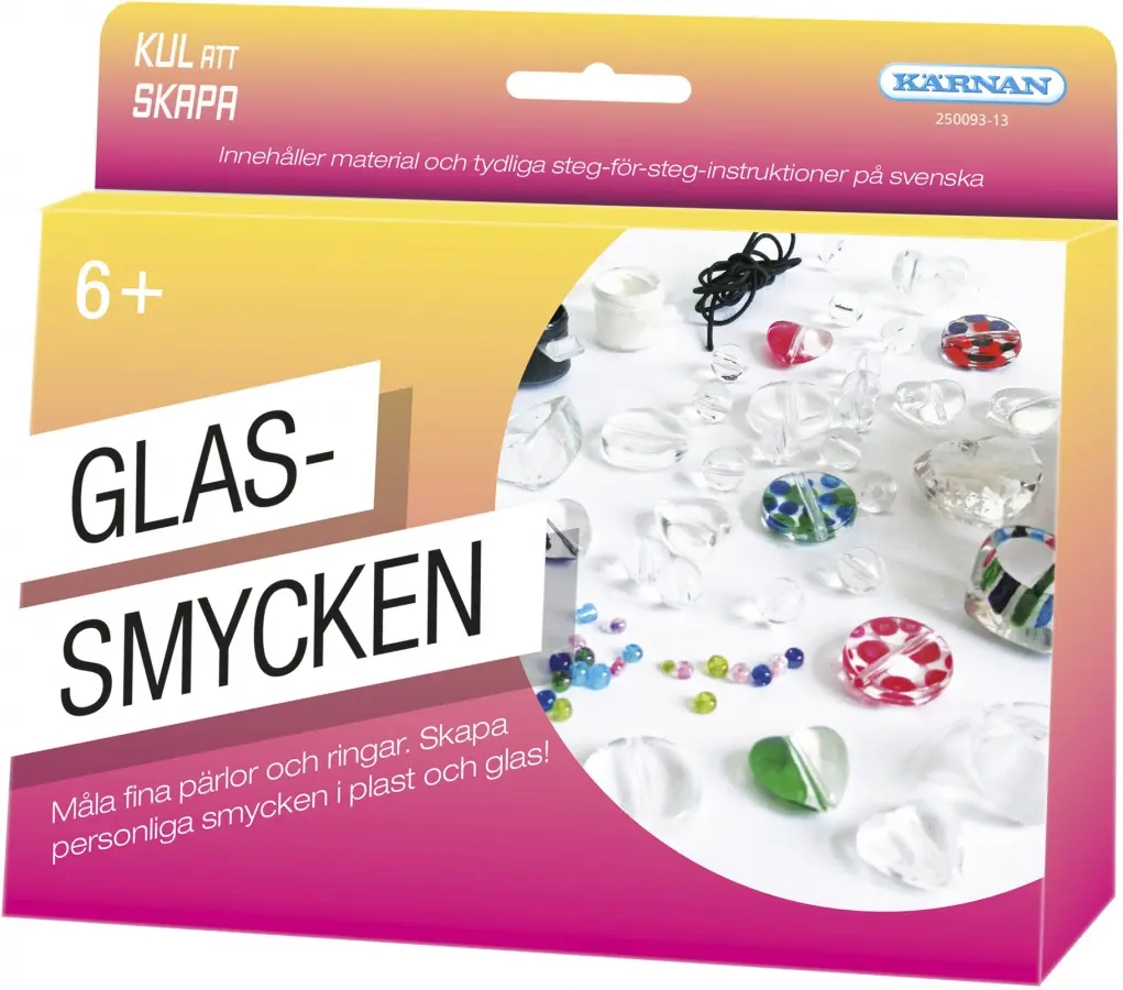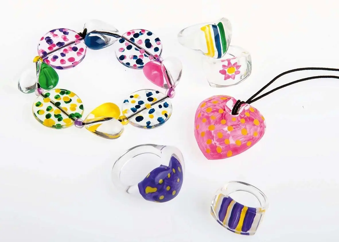 Skapa personliga smycken i plast och glas genom att måla dem själv! Måla på ringar och på pärlor som du kan fästa i halsband och armband.