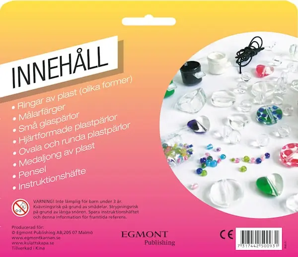 Innehåller: Genomskinliga ringar av plast (med olika former), målarfärger, små glaspärlor, hjärtformade plastpärlor, ovala och runda plastpärlor, medaljonger av plast, pensel och instruktioner.