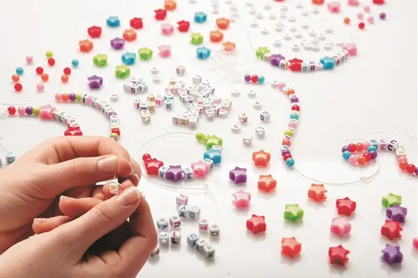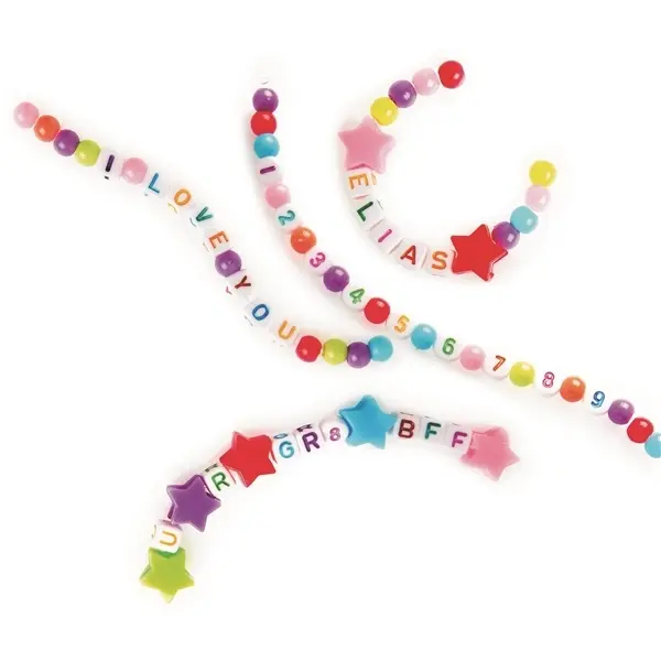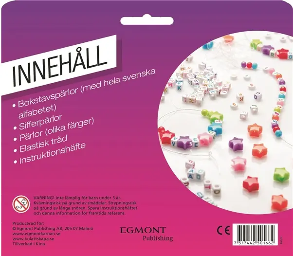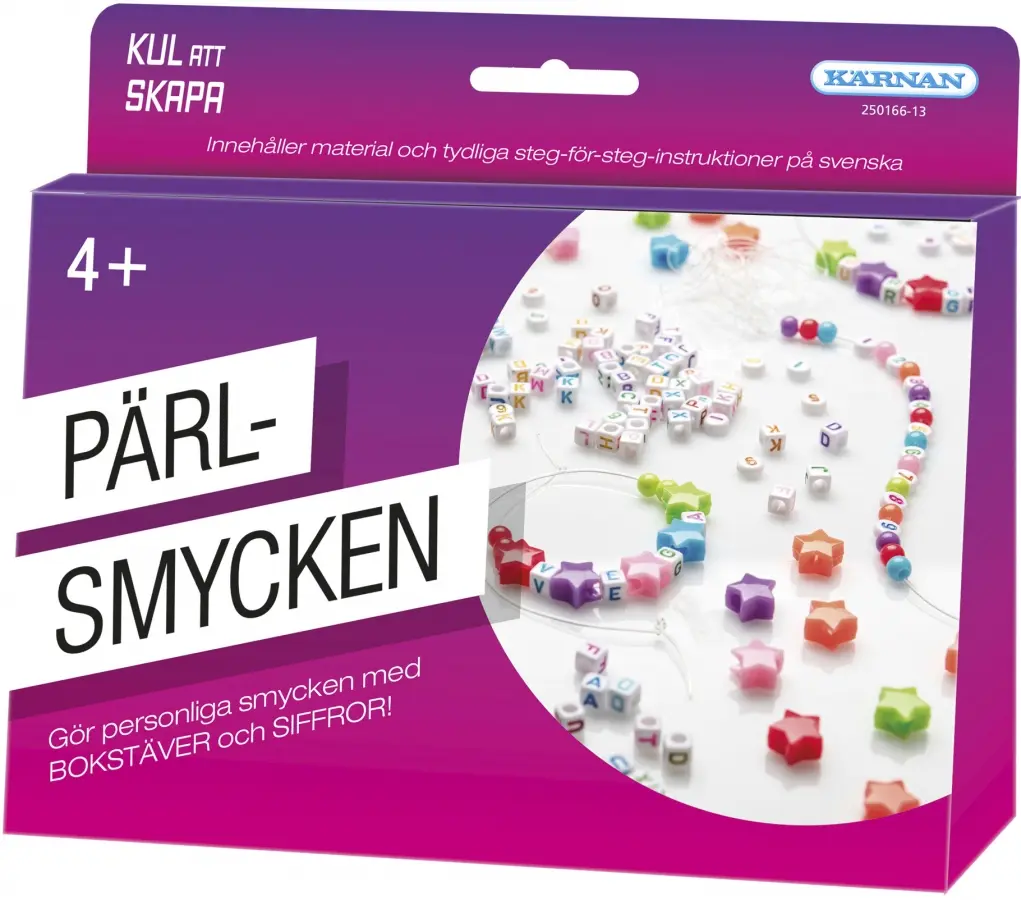Innehåller: bokstavspärlor (med hela svenska alfabetet), sifferpärlor, pärlor (olika färger och former), elastiska band och ett instruktionshäfte med tydliga instruktioner.