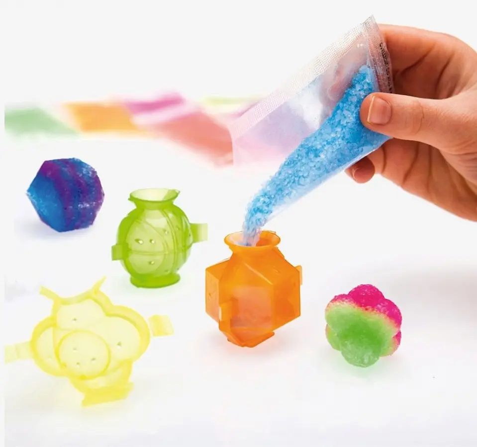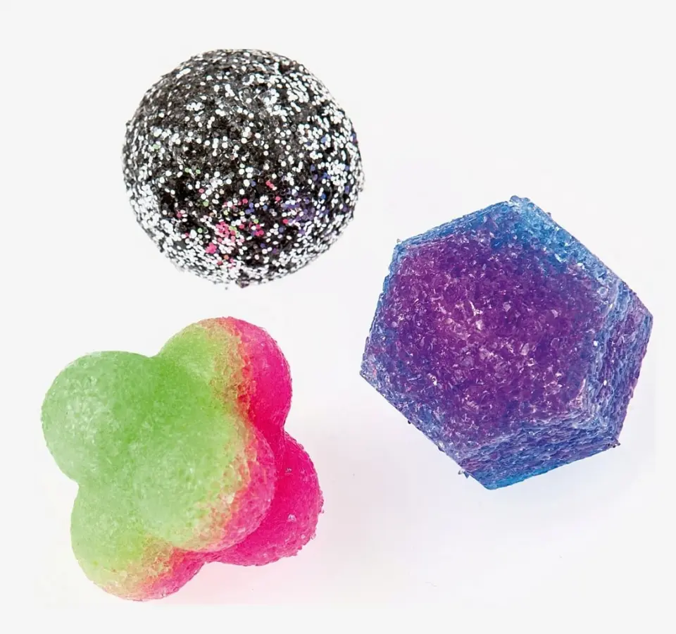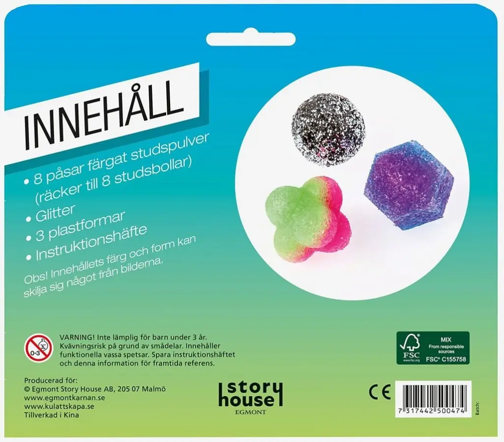 Innehåller: 8 påsar färgat studspulver (räcker till 8 studsbollar), glitter, 3 plastformar och instruktioner.
