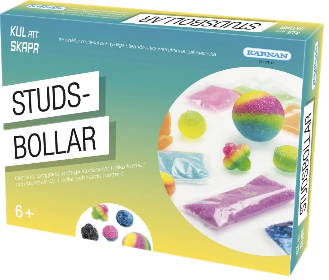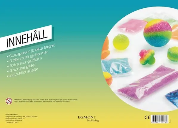 Innehåller: Studspulver (8 olika färger), 3 olika små gjutformar, en extra stor gjutform, 3 sorters glitter och instruktioner.