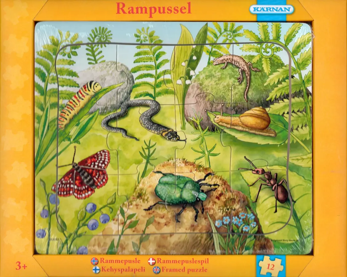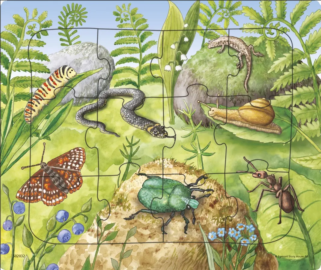Ett rampussel där vi får en inblick i smådjurens värld i skogen. Här finns en fjärilslarv, fjäril, skalbagge, myra, snigel och ödla som alla stortrivs bland gräs, gröna blad, ormbunkar och blåbärsbuskar. Men se upp, bland stenar och liljekonvalj slingrar sig en orm fram!