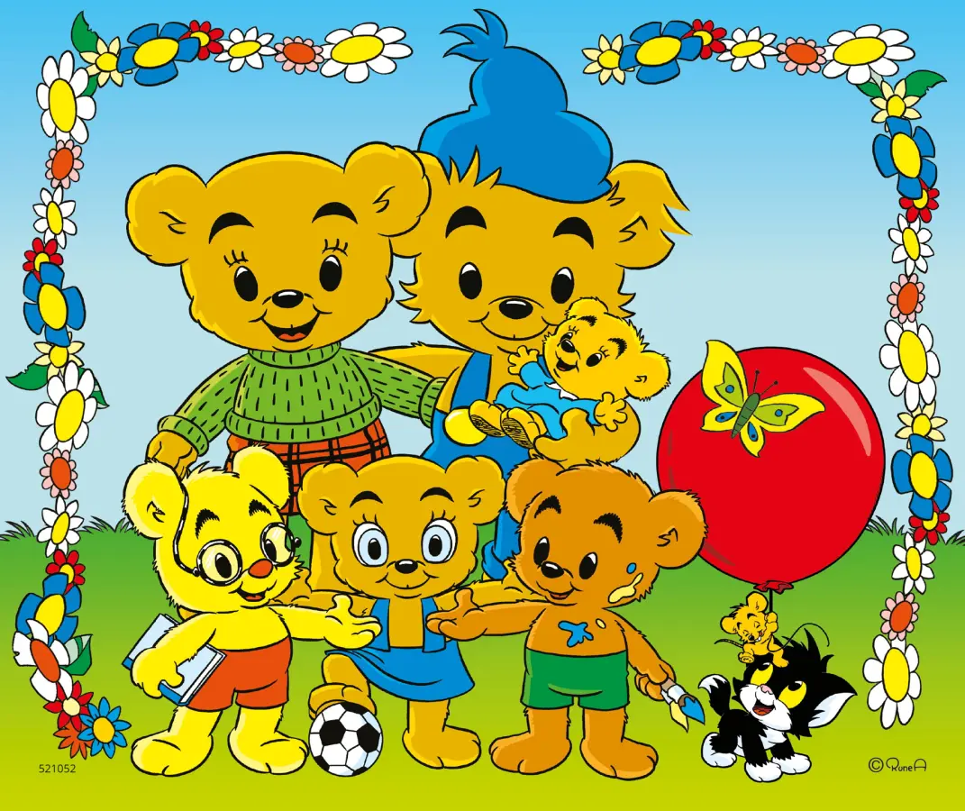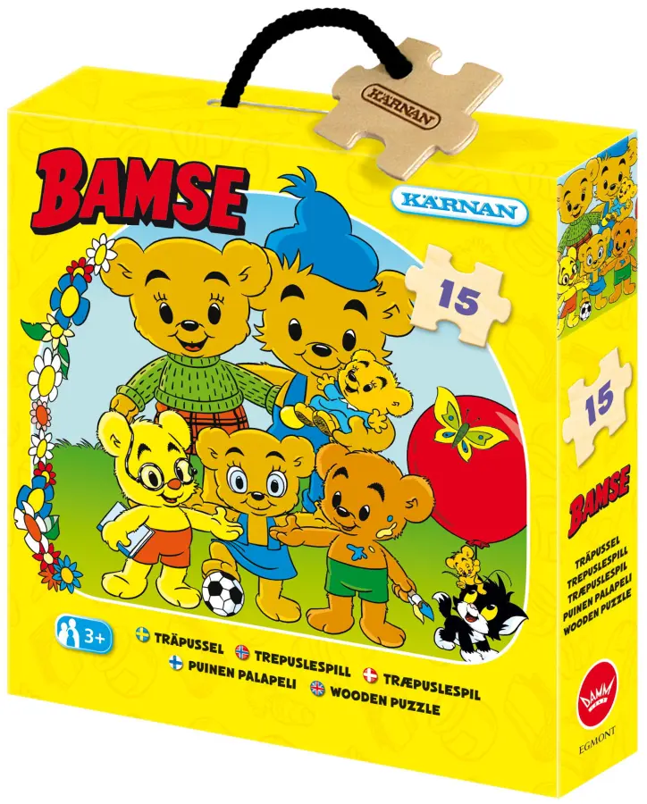 Bamse har samlat sin familj för en gruppbild på gräsmattan, Katten Jansson och Husmusen får också vara med och med sig har de en stor röd ballong. Ett härligt barnpussel i trä med 15 greppvänliga bitar.