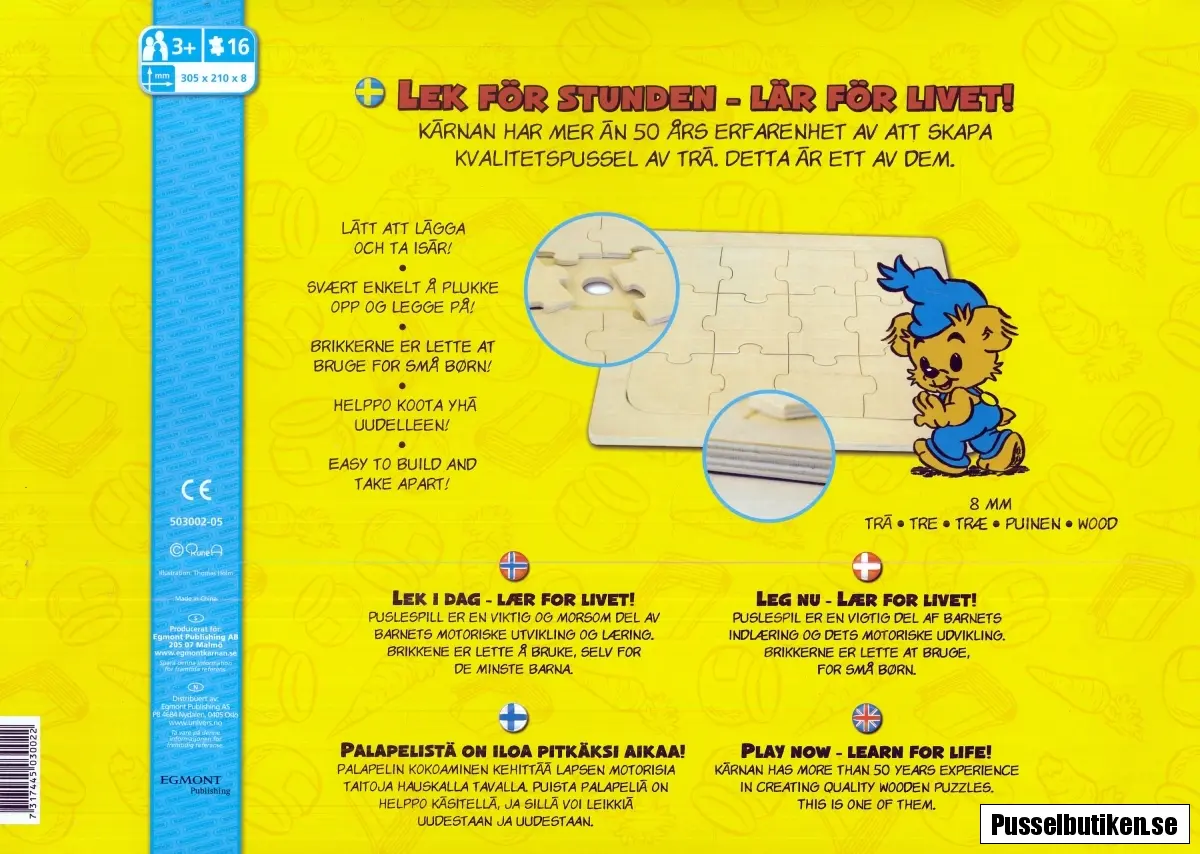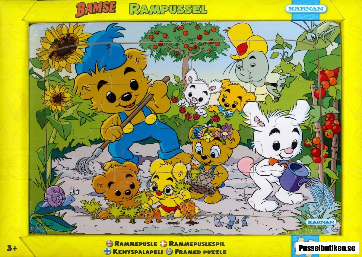 Rampussel i trä med 16 bitar och motiv av Bamse och hans vänner.