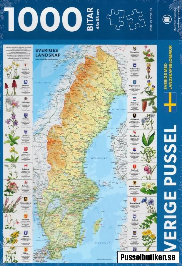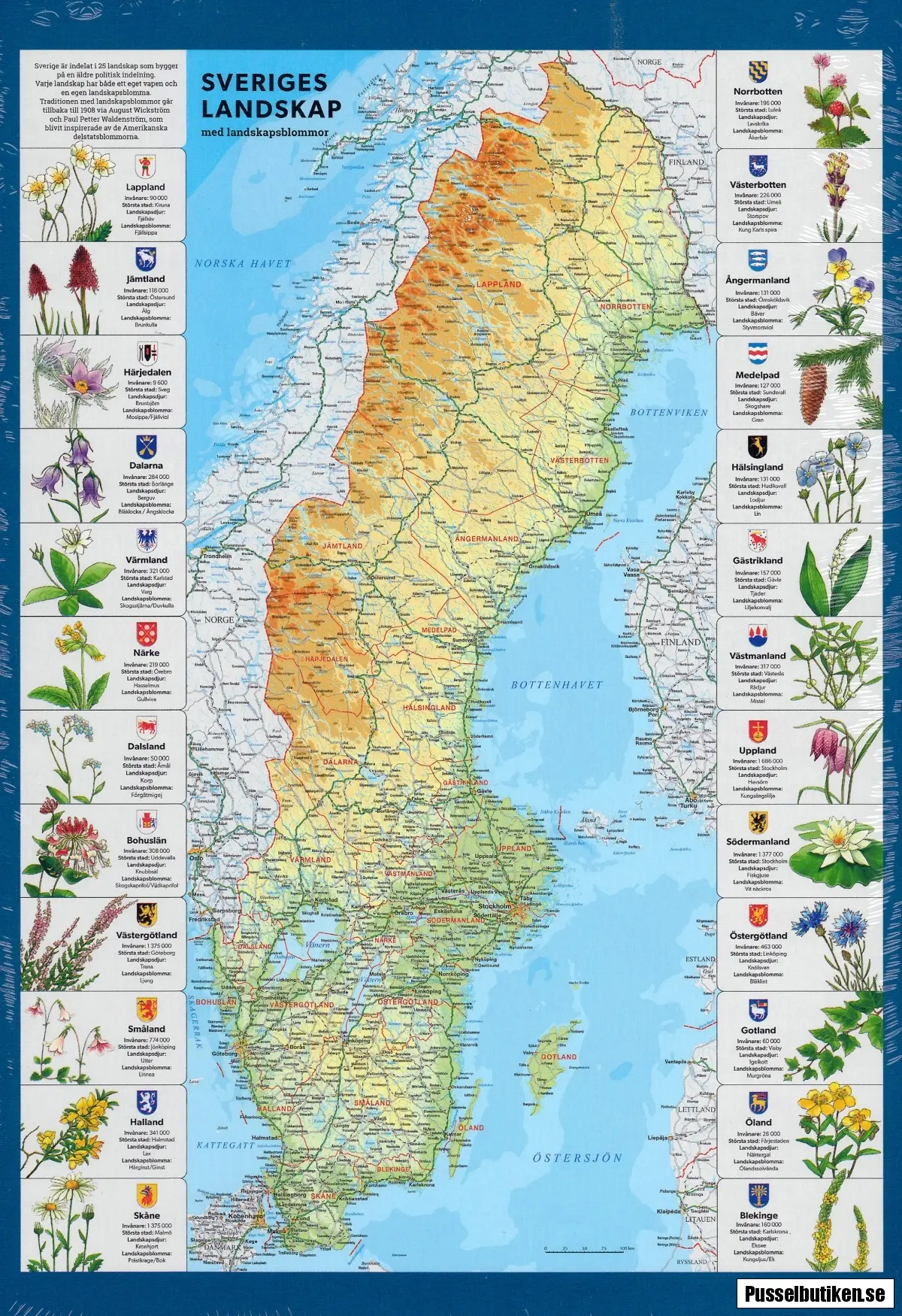 Lägg pusslet och lär dig mer om Sveriges landskap och tillhörande landskapsfakta om landskapsdjur, landskapsblommor, invånarantal och största städer.
