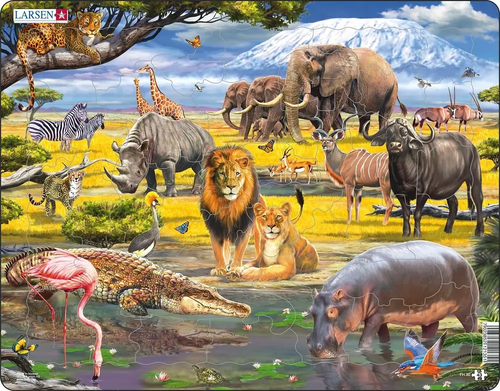 På den afrikanska savannen ser vi flera olika vilda djur. I bakgrunden ett snötäckt berg.