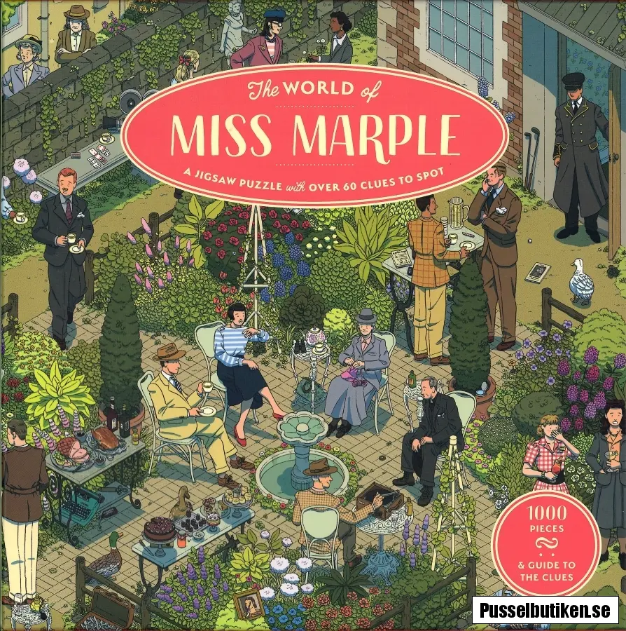 Du kommer kanske behöva använda hennes pålitliga kikare för att hitta alla ledtrådar i den här trädgårdsfesten, där mer än ett mordvapen är gömt bland te, kakor och förnäma gäster. Hitta alla dina favoritkaraktärer i detta invecklade pusselmotiv som refererar till samtliga av Agatha Christies älskade detektivromaner. Kan du hitta alla 60 ledtrådar?