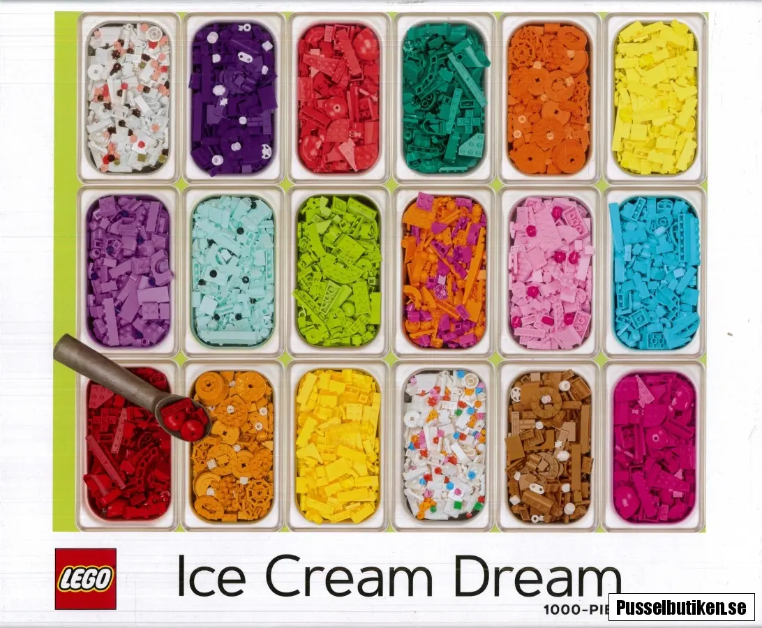 Detta 1000-bitars pussel kommer att tillfredsställa ditt sötsug och din kärlek till klassiska LEGO-bitar. Sätt ihop bitarna och se hur en regnbåge av glassmaker, med en LEGO twist, träder fram under dina fingrar.