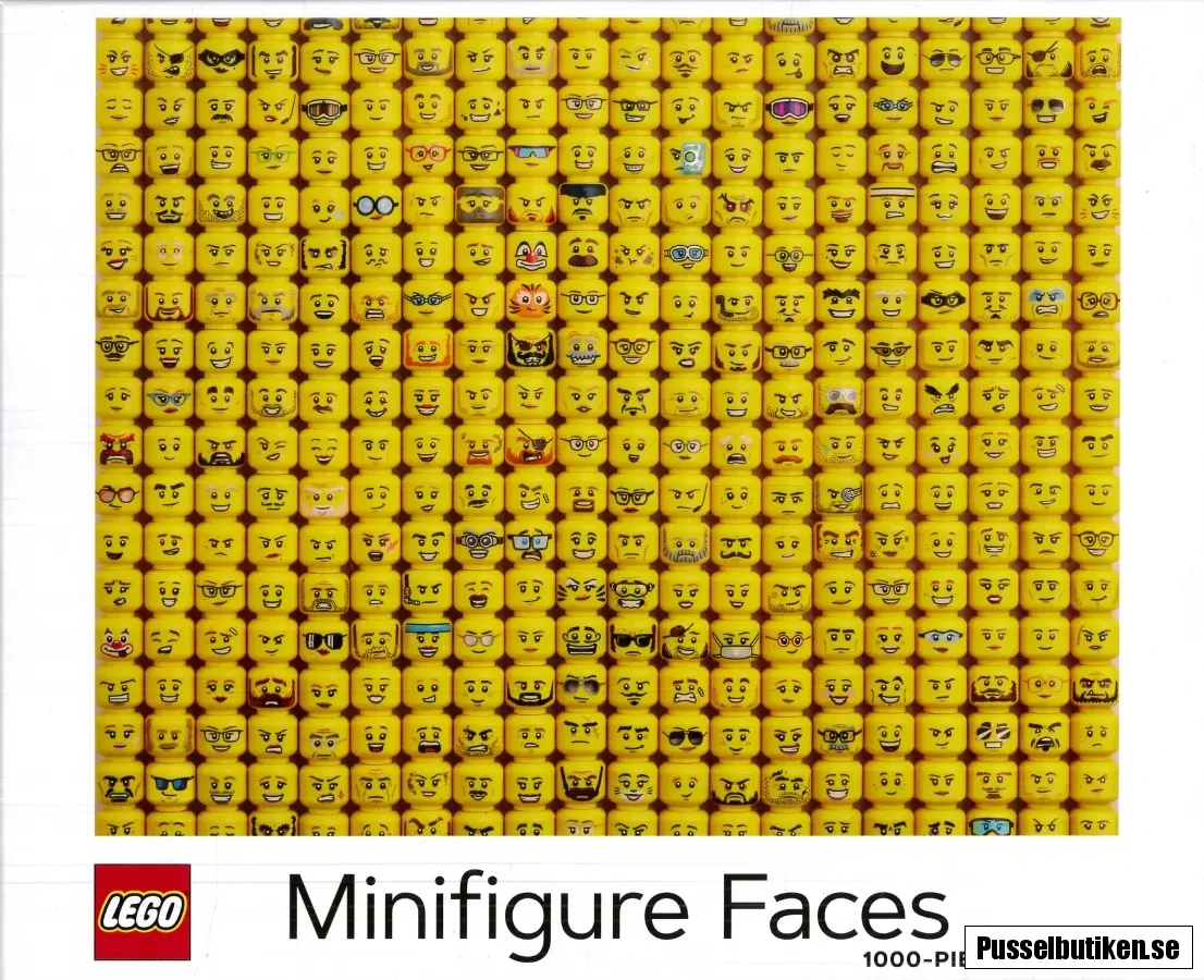 Ett extra klurigt pusselmotiv med ett massivt kollage av gula små LEGOfigur-huvuden med olika ansiktsuttryck.