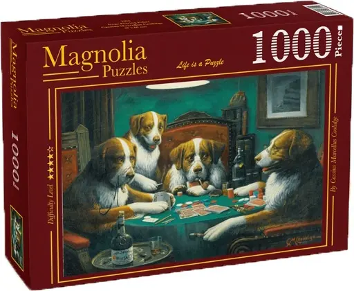Cassius Marcellus Coolidge har målat det här utmanande och roliga pusselmotivet av hundar under ett intensivt pokerspel.