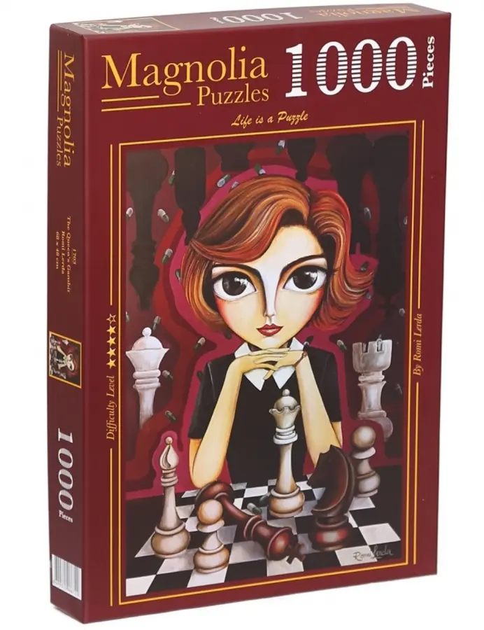 Porträtt ur den prisade dramaserien "The Queen's Gambit", illustrerad av konstnären Romi Lerda. Den föräldralösa, nioåriga flickan, Beth Harmon upptäcker och bemästrar schackspelet i USA på 1960-talet, men att bli känd så ung och kämpa i männens värld har sitt pris.