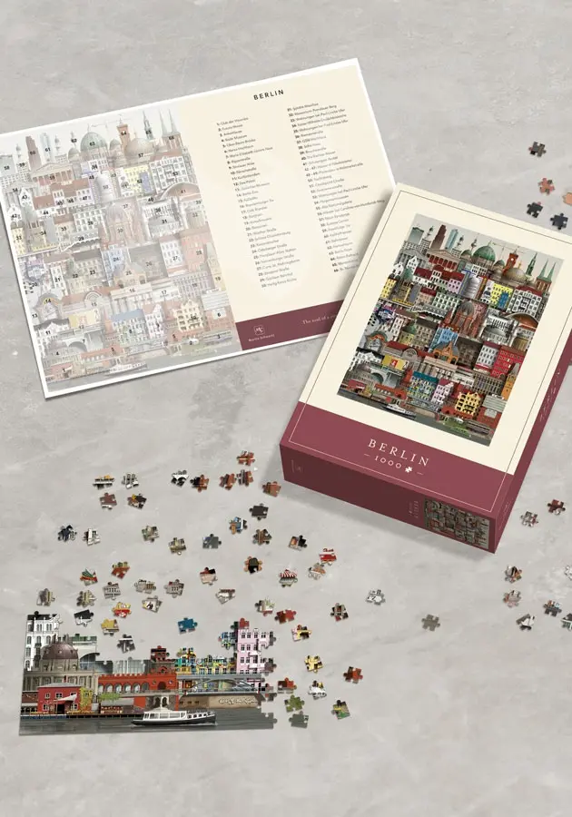 Berlin, en av Europas mest levande och innehållsrika huvudstäder. Här finns en spännande kultur- och konstscen, ett pulserande nattliv och historiens vingslag i varje gatuhörn. I det här pusselmotivet guidar konstnären Martin Schwartz dig genom stadens fantastiska arkitektur. I en enda bild har han försökt samla stadens mest omtyckta och berömda byggnader och platser. Kanske känner du igen några, och kanske får du upp ögonen för något nytt spännande resmål under pusslandets gång!