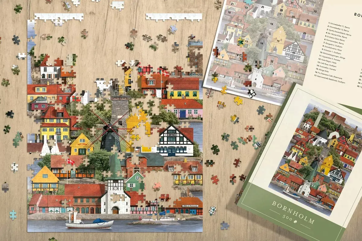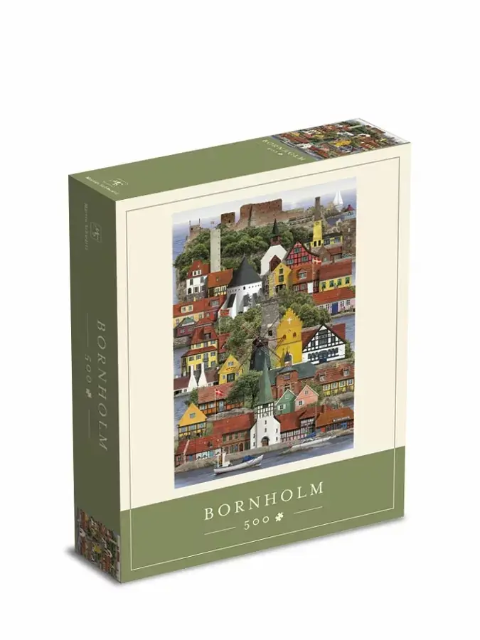 I det här pusslet får du den mycket speciella atmosfären på Bornholm fördelad på 500 bitar. Öns karaktäristiska charm har fångats av den danska designern och konstnären Martin Schwartz, som är känd för sina detaljerade illustrationer av städer och platser. Pusslet levereras med en komplett lista över alla byggnader på motivet, så att du kan lära känna Bornholm ännu bättre.