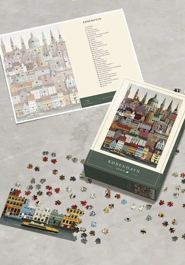 Konstnären Martin Schwartz har komprimerat stadsvyn och med noga omsorg valt ut russinen i stadens arkitektur. Medan du lägger pusslet kommer du att få chans att lära känna många av Köpenhamns byggnader och längs vägen förhoppningsvis även upptäcka något nytt som du inte har lagt märke till tidigare.