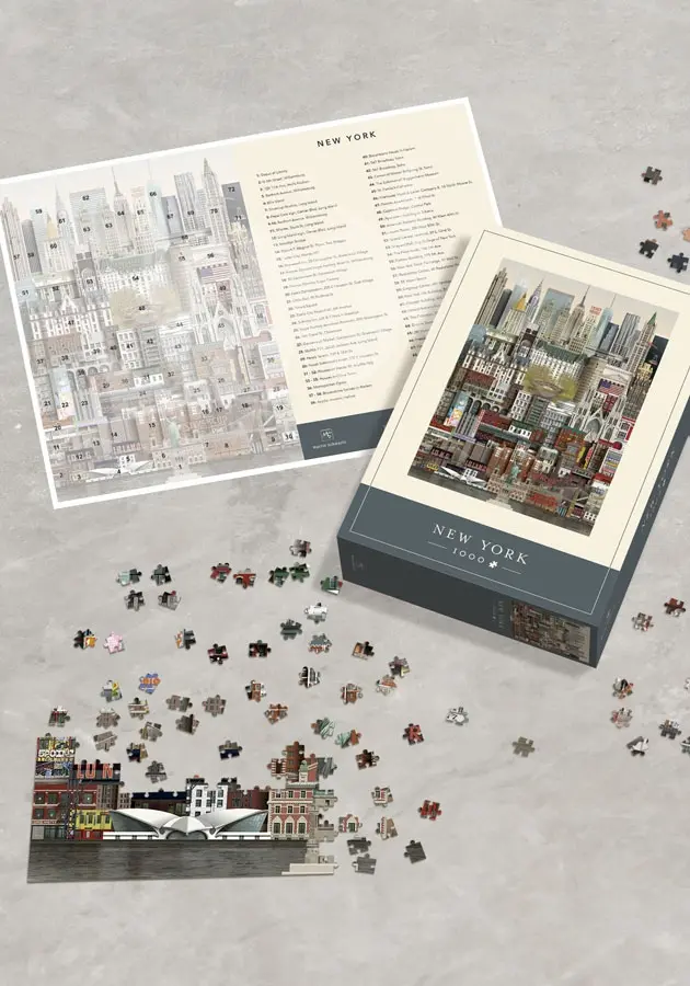 New York, drömmarnas stad, där just din dröm kan slå in! I det här pusselmotivet får du den pulserande stadsvyn i 1000-bitar och i tolkning av konstnären Martin Schwartz. Stadens kända byggnader trängs i bakgrunden och i centrum står Frihetsgudinnan stolt med sin höjda fackla. En perfekt chans att lära känna New York och dess arkitektur på ett roligt sätt!