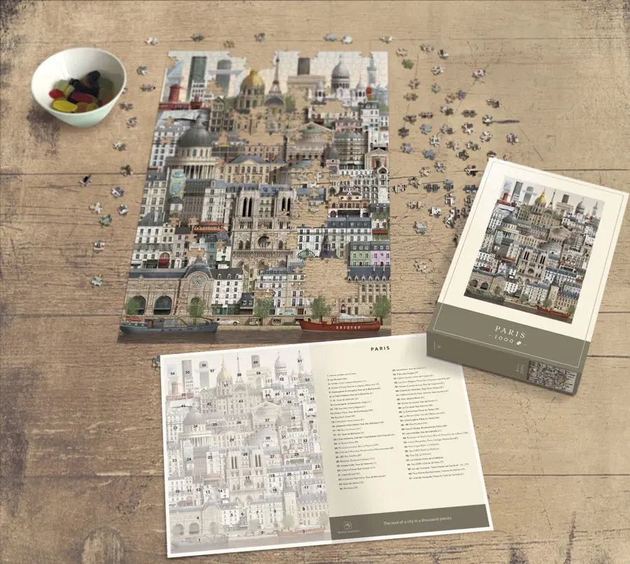 Ett pussel där konstnären Martin Schwartz har tolkat kärlekens stad Paris i 1000 pusselbitar. Han har försökt fånga stadens själ och arkitektur in i minsta detalj i ett enkelt och samlat uttryck. Känner du igen alla ikoniska byggnader?