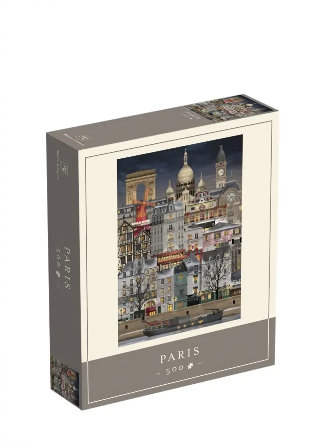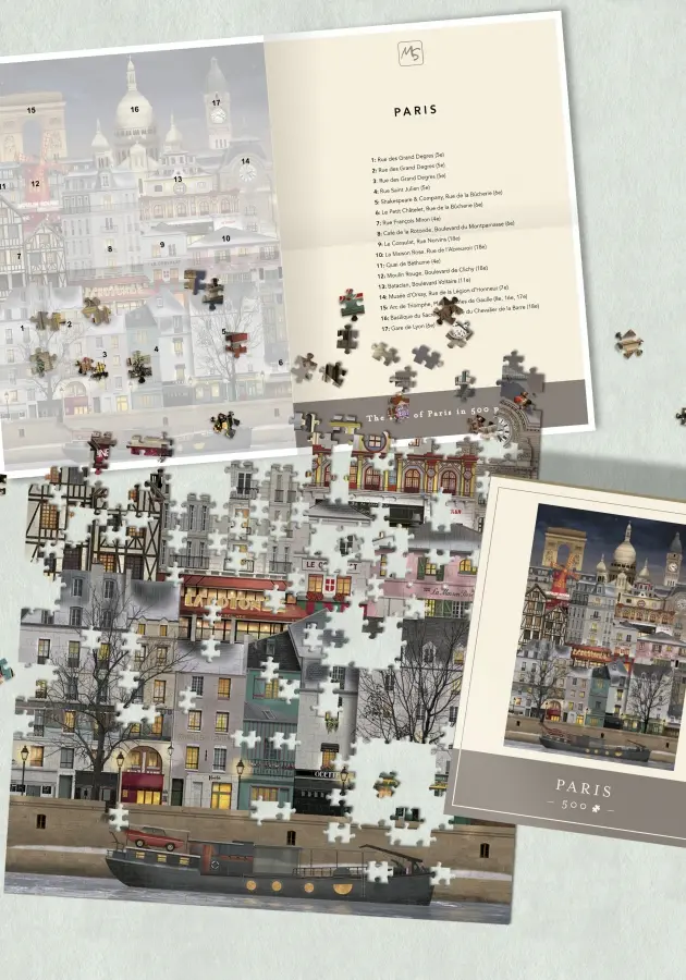 I det här pusselmotivet har konstnären Martin Schwartz gjort sin egen tolkning av kärlekens stad Paris under en stjärnklar natthimmel. Han har försökt fånga stadens själ och arkitektur in i minsta detalj, men i ett enkelt och samlat uttryck. Känner du igen alla ikoniska byggnader?